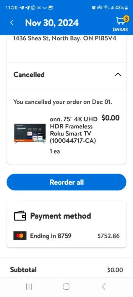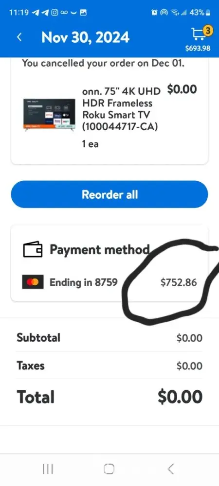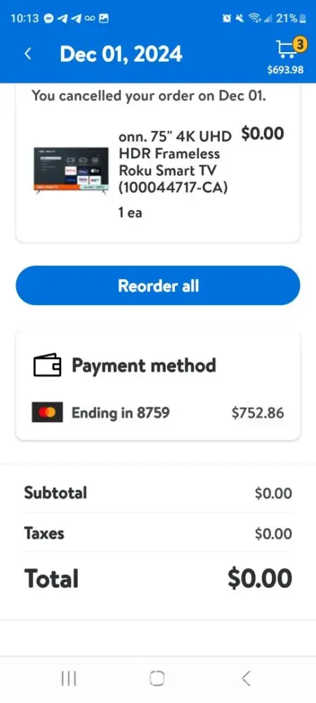 1. **Order Issues:** On November 30th, I purchased a TV for $752, which was canceled due to a "technical error." Unaware of being charged, I repurchased the same TV the following day, December 1st, and this second order was also canceled, resulting in the same charge of $752.