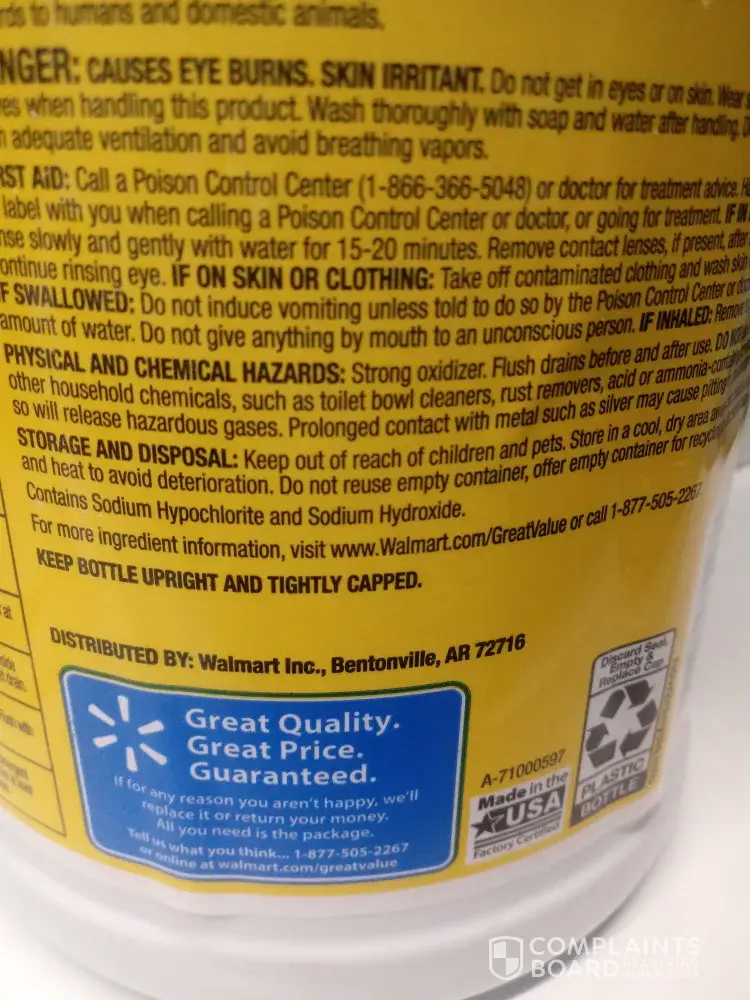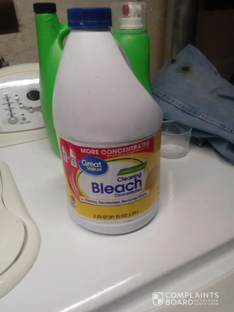 On 4/9/21 @ 16:32pm store # 02581 I purchased the Great Value bleach along with some other items. I noticed on the shelf that there were a couple of bottles that seem they were missing product & chose a full bottle. After cashing out I proceeded to load my trucks back floorboard. I had placed the bottle of bleach on the floor and had items around it. When I...