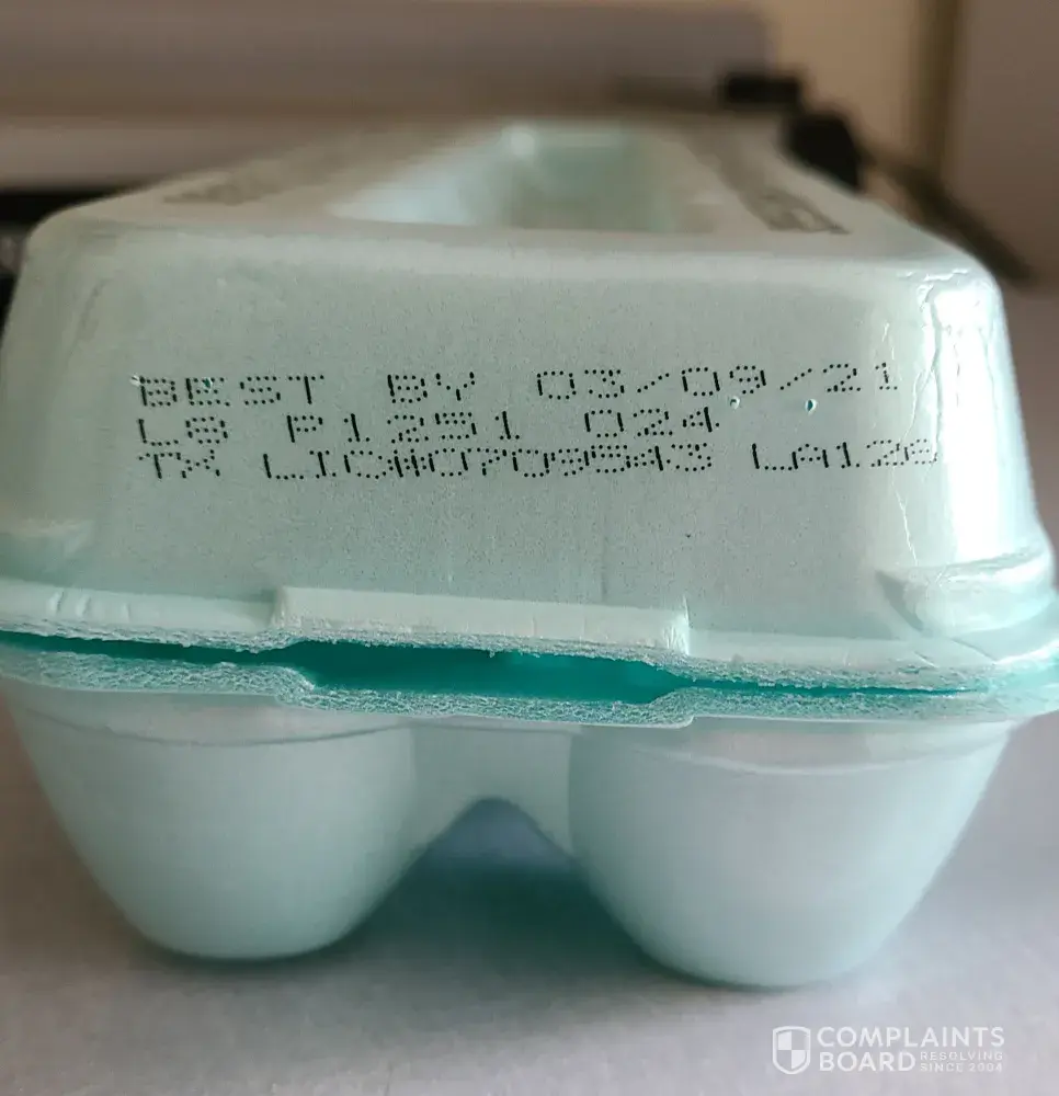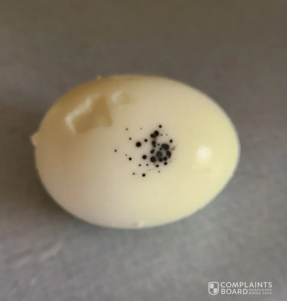 Purchased 12 "Lage White Eggs" from Walmart in Valdosta GA Feb. 8th 2021. Decided to hard-boil five of them on Feb. 9th. Three out of the five had black spots on the soft white outer part of the egg just underneath the shell after peeling. The carton says "best used after March 9". Needless to say I threw them out. I have the carton and the receipt if necessary. [protected]@aol.com