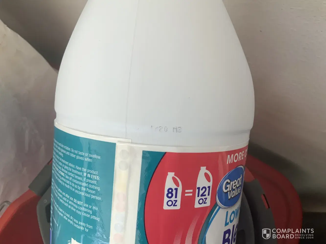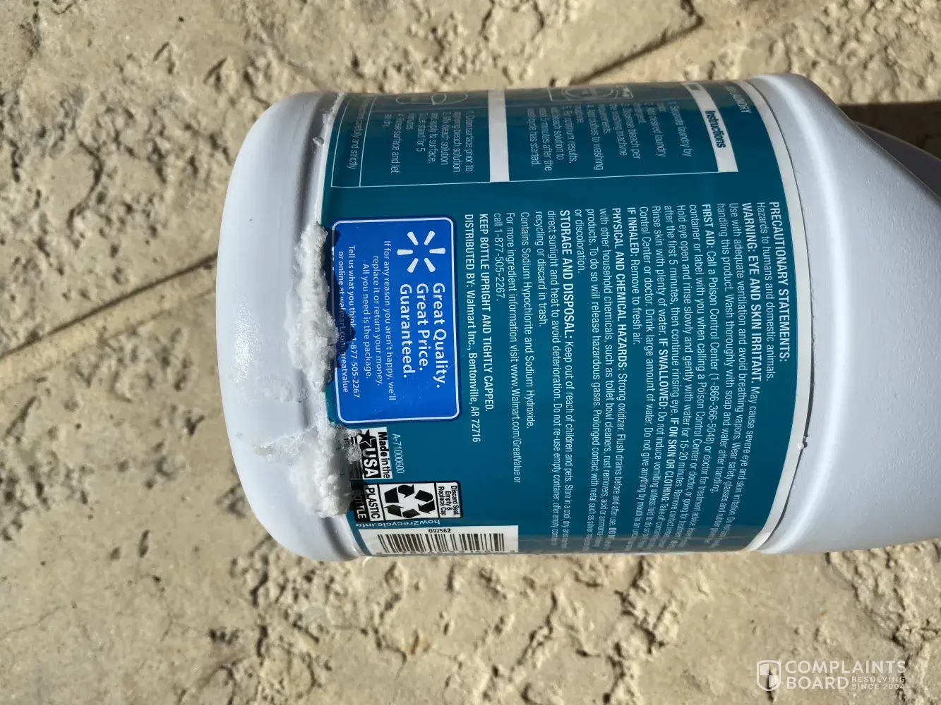 Good day, Unfortunately I have a rather large complaint regarding your Great Value Brand Bleach. I purchased the bleach 3 weeks ago and placed it on my laundry room shelf as with all my laundry needs. 3 days ago I opened the jug of bleach and did my whites. Today 8/22/2020 my husband started a load of white bed sheets when he noticed the damage from the...