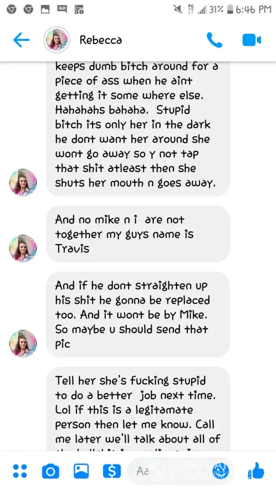 An employee of walmart in augusta ga located on deans bridge rd her name is rebecca boyd she messaged a friend of mine and said ugly hateful untrue things about me... She is having an affair with my fiancee.. She is known to work at wal-mart under the influence of drugs.. I have evidence which are messages from her to my friend. A employee of the company should be respectful honest and mature among other things.. This is who is supposed to be representing walmart the face of walmart.. She is very unprofessional and rude and working under the influence is a hazard to others.. Safety violation.. If the situation and individual isnt professionally dealt with... Ill hire an attorney to assist with the problem.. Slander is illegal and to treat another and or speak of someone in such a way with no knowledge of who they areis wrong and gives that individual a bad reputation under false /lies from another... Your company employees this individual which puts you and your business in a spot light you don't want thank you for taking the time to read