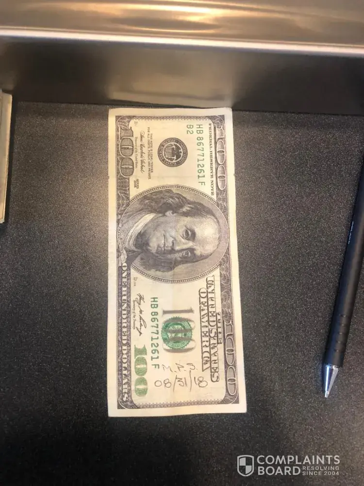 I'm telling the bank teller I need some of the money changed and some deposited. She's taking the money, she's counting it and she's telling me one bill it's fake.I said ok, will you give me another one instead, she's telling me that's not the bank policy, but if I want I can file a complain ( a counterfeit note report) with her manager to serve me trying to get my $100 back from the business I received from. He's giving me the complain paper and I'm putting my initials and date on the bill. The manager is also allowing me to take a photo of the bill.They're excuse themselves again, telling me this is a federal law and nothing they can do about it.