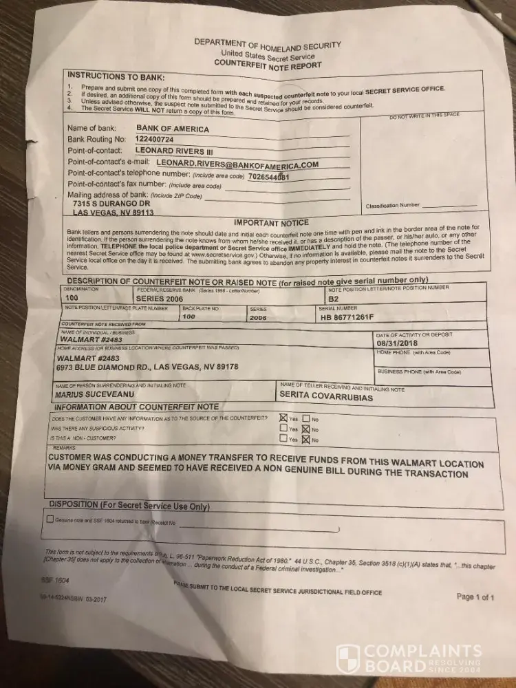 So I'm on my way back to the Walmart to try to talk with a teller or a manager about my problem. The time is around 4:40 PM. The teller in there, a different lady than the one who gave me the money she's looking at the paper and she's calling one of her manager. So JB, her manager is coming and I explain him what's going on. $3000 received on this location, 30 minutes ago, 1 of the bills handed to me is fake, this is the counterfeit note report from the bank, this is the photo of the bill that was fake. The manager starts to talk with me with "buddy", I'm addressing him sir. He's asking me if I believe a billion dollar company would give me $3000 in fake bills. I told him no, please read the paper, it clearly states that one bill was fake. He's telling me, his "buddy" again, that all the bills are ran through the machine and they can't give one that's fake. I doubt that, since the cashiers are not checking it under UV light or with a pen, but, anyways, I'm telling him to stop patronizing me because at this point I'm quit annoyed by his "buddy" and "bro" so I'm telling him I would like to talk with his supervisor. He's taking the note I received from the bank and walks away "to investigate". Upon arriving, he's asking me If I left the premises of the Walmart, and I'm telling him it's obvious since he's holding the note report from the bank. At this point he's telling me there is nothing he can do, so I'm asking to talk with his manager, to which he's replying me she's in vacation. I told him he should have a supervisor, he's telling me again she's in vacation.