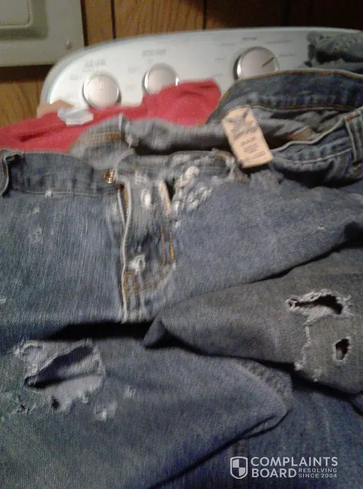 I bought 3 pairs of Faded Glory carpenter jeans and all 3 pairs have ripped and shredded around the mid-thigh area. One within a week another pair in about 2 weeks and so on. I would have taken them back but I bought them several months ago while on sale until I needed a newer pair to wear. It is not my washers fault or detergent because all my other jeans are okay. It was only the Faded Glory brand. I will not be buying any more products from this brand and will take caution on anything else before buying.