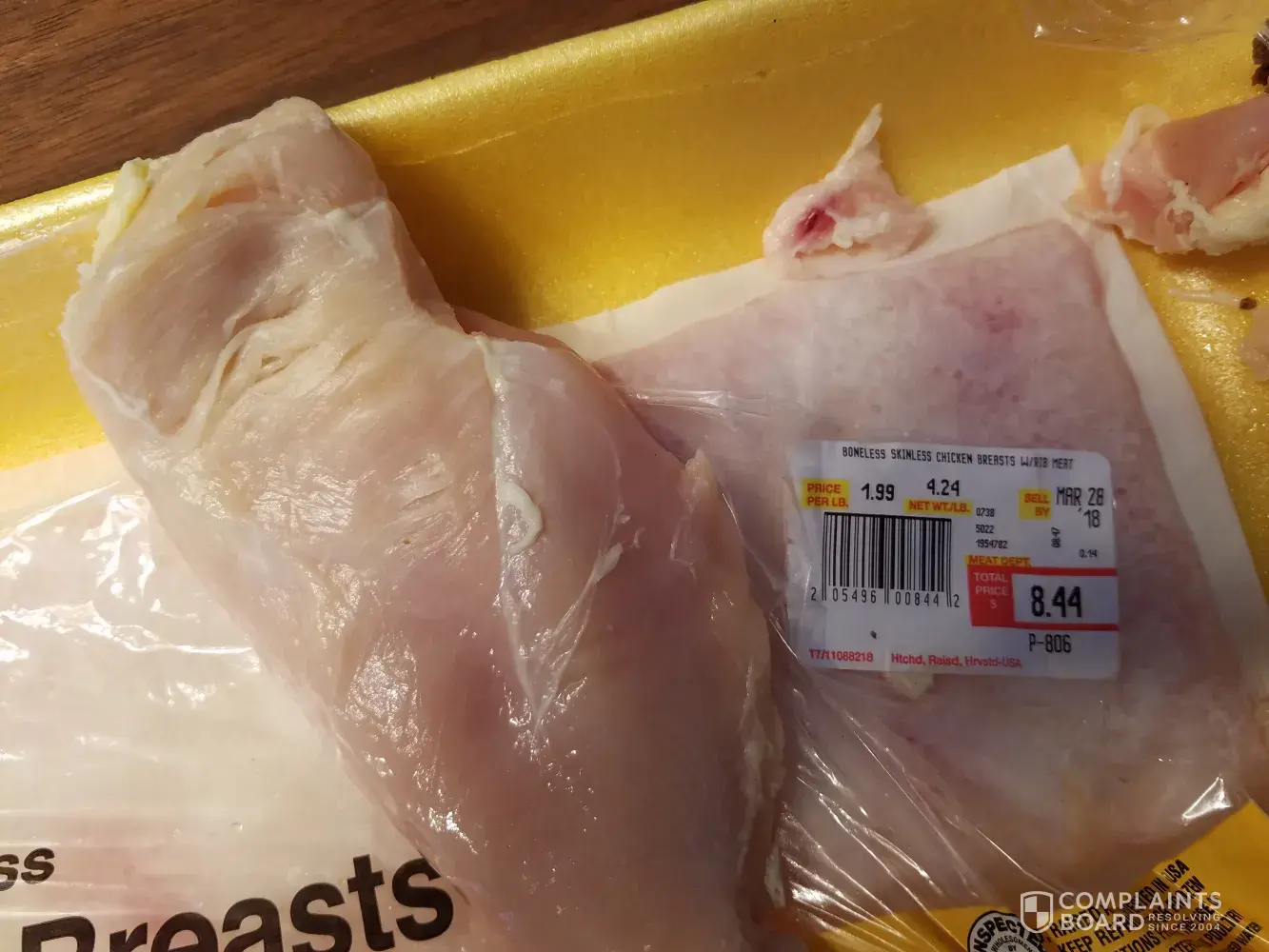 We purchases a package of boneless chicken breast on Saturday march 24 in Clifton park ny.. we opene it on sunday march 23 and there was a chicken that was freezer burned and the sell by date was marked for March 28 how can a freezer burned chicken get into a package that is suppose to be fresh? And the rest of the chickens were so fatty that after trimmed and cooked there wasn't hardly anything there.see pics attached