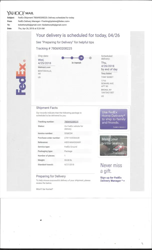 My name is Tony Bobet from New York City. I am filing an complaint to Walmart.com that located at 2100 88th Street, North Bergen, New Jersey, 07047. I order on April 25, 2018. I order an 5-door cabinet for $52.89, the order number is #[protected]. The carrier is FedEx.com. The tracking is [protected]. I have been here all day. they say they were an attempt of deliver my item. they think have a business. they are stupid.