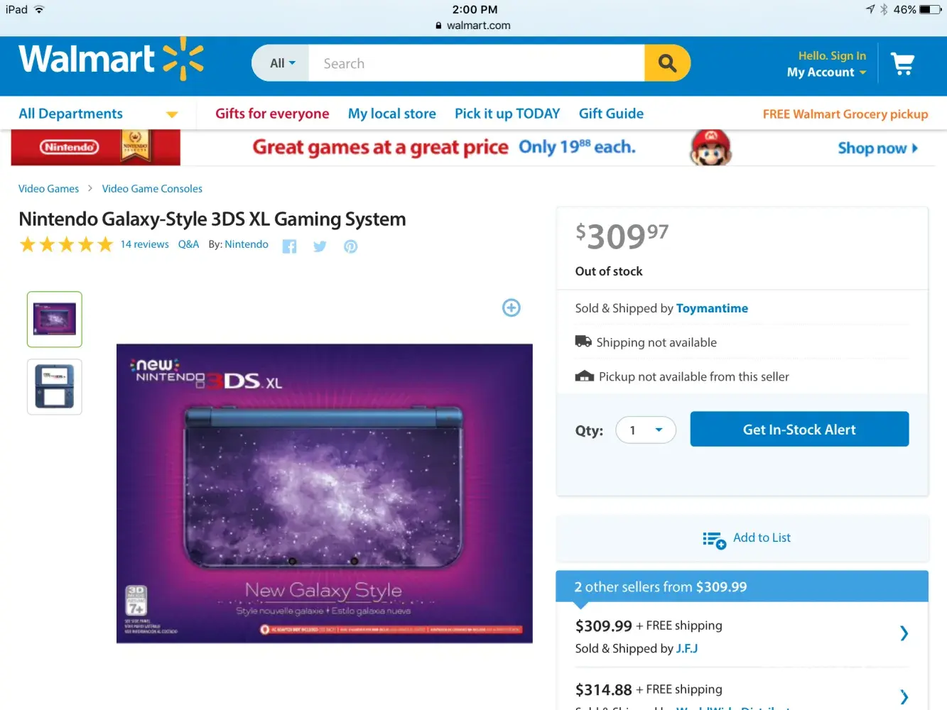 Disgraceful. They should lower the price and refund the difference to their customers who paid $309.00 for this item. A refund can be delivered in the form of a gift card for walmart if that is the best way for the company to resolve the issue. I did not purchase this device and would not have at that price, but clearly many people did. Additionally they offer two additional purchase options from outside sellers, presumably because they are out of stock and this is a holiday wish list item for many children. The alternate seller prices are $309.99 and $314.88.