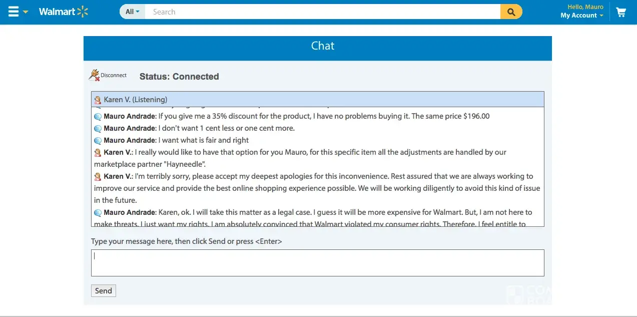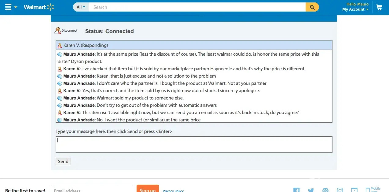 I purchased a Dyson V6 Slim Cordless Vacuum during Black Friday thru Walmart online store. I received a purchase confirmation within minutes after the purchase as well as an email telling me that the item would be ready for pickup at the store within the same day. The item was not available at the store when I went to pickup it up the following day. So I contacted customer service today (11/26) and chatted with attendant Maria M. She assured everything was ok with my purchase and that my item would be ready for pickup today Saturday (11/26). As a surprise I received an email from Walmart saying that my purchase was cancelled. I once again contacted Walmart thru online chat and attendant Jose T told me that the item was cancelled because it was out of stock. I replied that this was unacceptable practice and that Walmart has sold me an item and delivered my item to another customer or to someone else. He offered me to buy a totally different item at a higher price as a compensation for their 'mistake'. I rejected the offer. he than proceeded as to offer me a 10% discount on any purchase at Walmart. I told him that this was once again unacceptable and the the discount I had on my item was at 35%. I even mentioned that a VERY similar item is being offered at the online store and I would be more than pleased to buy the similar item at the same price I had purchased the original price. After waiting for almost an hour, attendant Jose came back with no solution and with a rather automatic answer as to say that the item was 'unfortunately' out of stock. I did not settle for such answer. He than proceeded to forward our chat to supervisor Karen who had the same automatic answer as attendant Jose. She only added that it was not Walmart's fault because the item was being sold by a partner! What? I didn't by the item from any partner. I bought the item from Walmart! I have been escalated to attendant Whittley P. But no luck and the problem persists. This is clear consumer violation as well as false advertising as I understand. Stay away from Walmart.