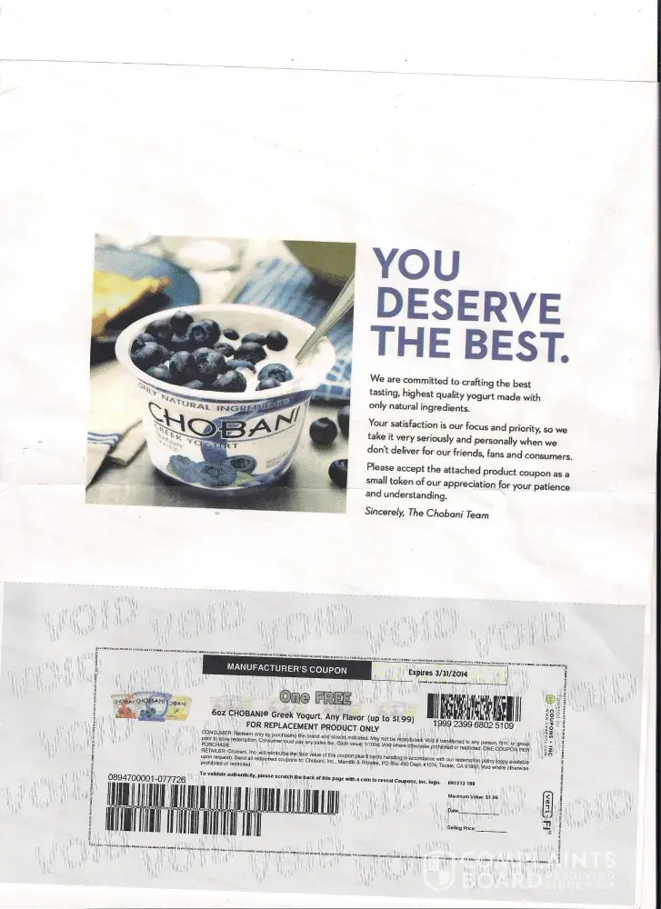 I went to redeem several Chobani Yogurt coupons last night at Wal-Mart- 3025 Lancaster Dr Ne, Salem, OR 97305. I had several free coupons for Chobani products that they sent me to replace the ones that were bad that I had purchased when all of the mold got into their product. The yogurts were recalled because they were making people sick, so they sent out...