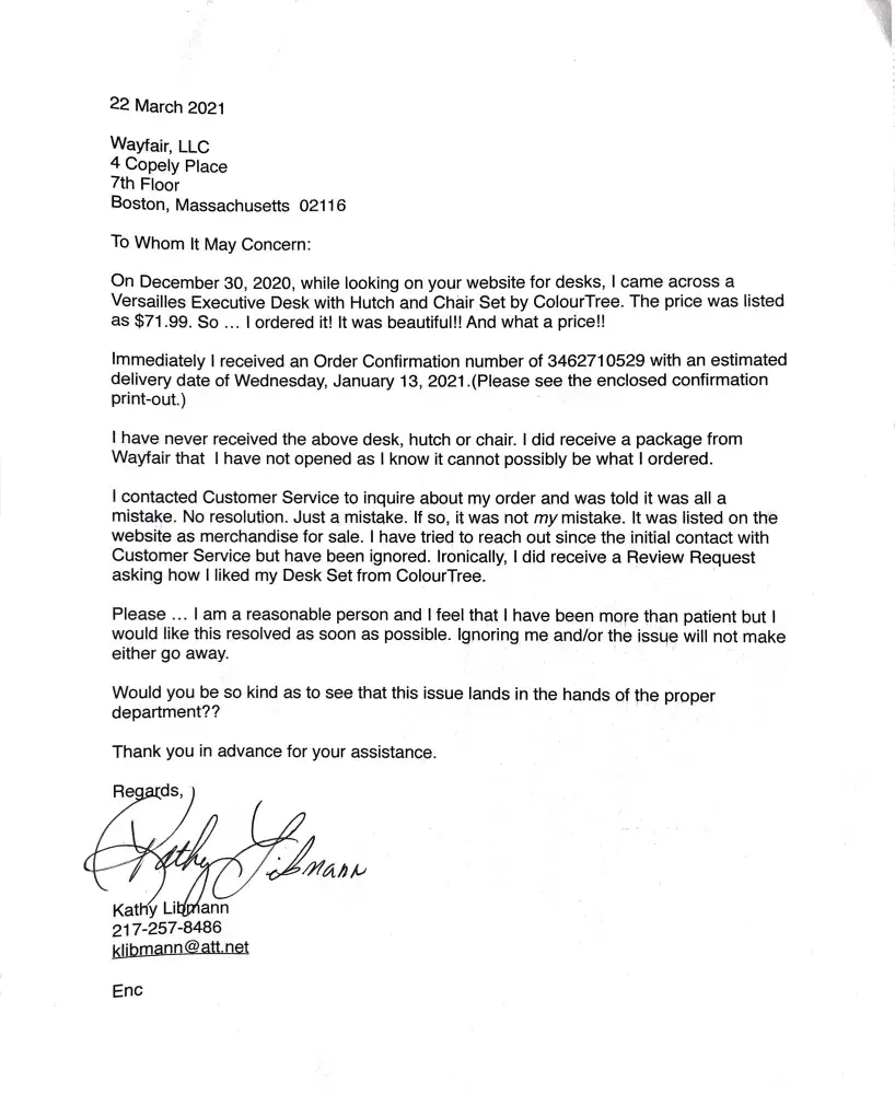 On 12/30/20 I placed an order for a Desk, Chair and Hutch. The price was listed and I agreed to the price. My order and my payment went through and I received confirmation (#[protected]) with a delivery date of 1/13/21. (Please see attached confirmation.) But I did not receive what I ordered. I received a very small package of some type of cloth. When I emailed them initially for a resolution they informed me that there was an error on their part and they could not sell me the items I ordered for that price. The problem is, they already DID sell me those items at that price when they accepted my payment and sent confirmation. I sent a letter to the company (see attached) but was completely ignored. They recently refunded me the original amount of payment but that is not the result I was anticipating.