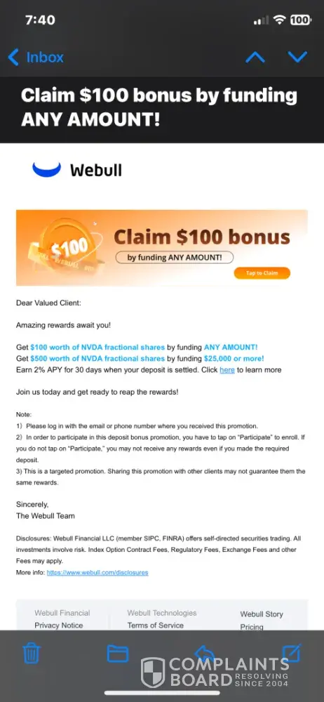 On July 15, 2024 I received a email from this company called Webull which is basically a commission-free online brokerage platform that offers trading services for stocks, ETFs, options, and cryptocurrencies. Anyway the email said that If I fund my Webull account by any amount I will receive $100 worth of NVDA fractional shares ( As shown in the Picture) so...
