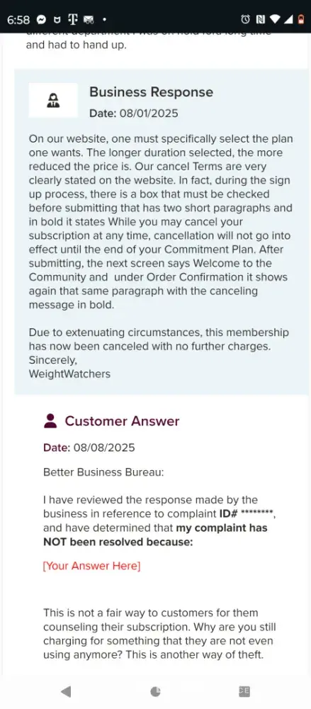 I basically have been charged $49.00 per month for March. April, May, June snd July with no avenue to cancel my subscription nor any means to obtain a refund. I am retired and on a fixed income. This is a great deal of money to me. This is a shoddy way to do business. After 28 years and referring 5-6 people to Weight Watchers, I will never use or recommend them again. The program may work but the problem resolution team takes care of Weight Watchers bank account and not their customers.
