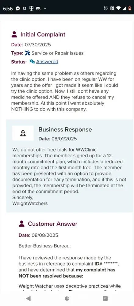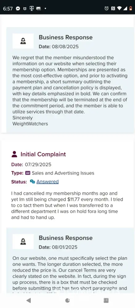 As you can see from multiple reviews on multiple sites, weight watchers intentionally is misrepresenting their intended actions when conning people into providing financially information. Once they have your financial information, they've been over backwards to refuse to release you from what they call a contract. Even while admitting that you misunderstood the terms. Which is a valid reason to terminating contract. It's a total scam.