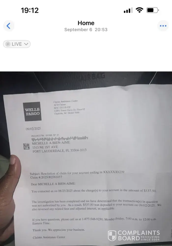 The next day, I got a notification that the wire had not gone through and to contact Wells Fargo. I called Wells Fargo, answered some of their verification questions and was told that the wire would go through this time.