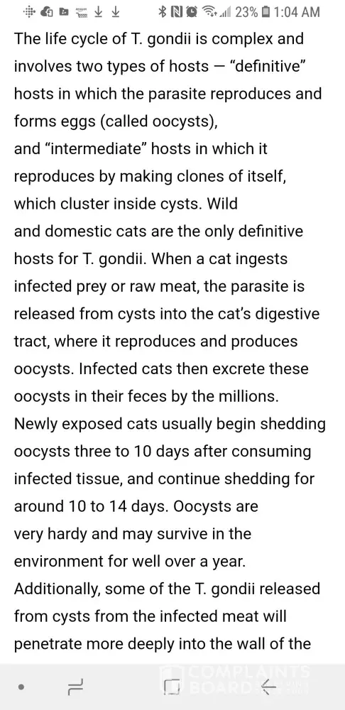 I went ahead and looked up toxoplasmosis. On the Cornell University website that shows that that is caused by cats eating infected animals or by eating raw meat. I do not feed Raw. So if the cat has that it's from eating a mouse or from the owner eating raw food.
