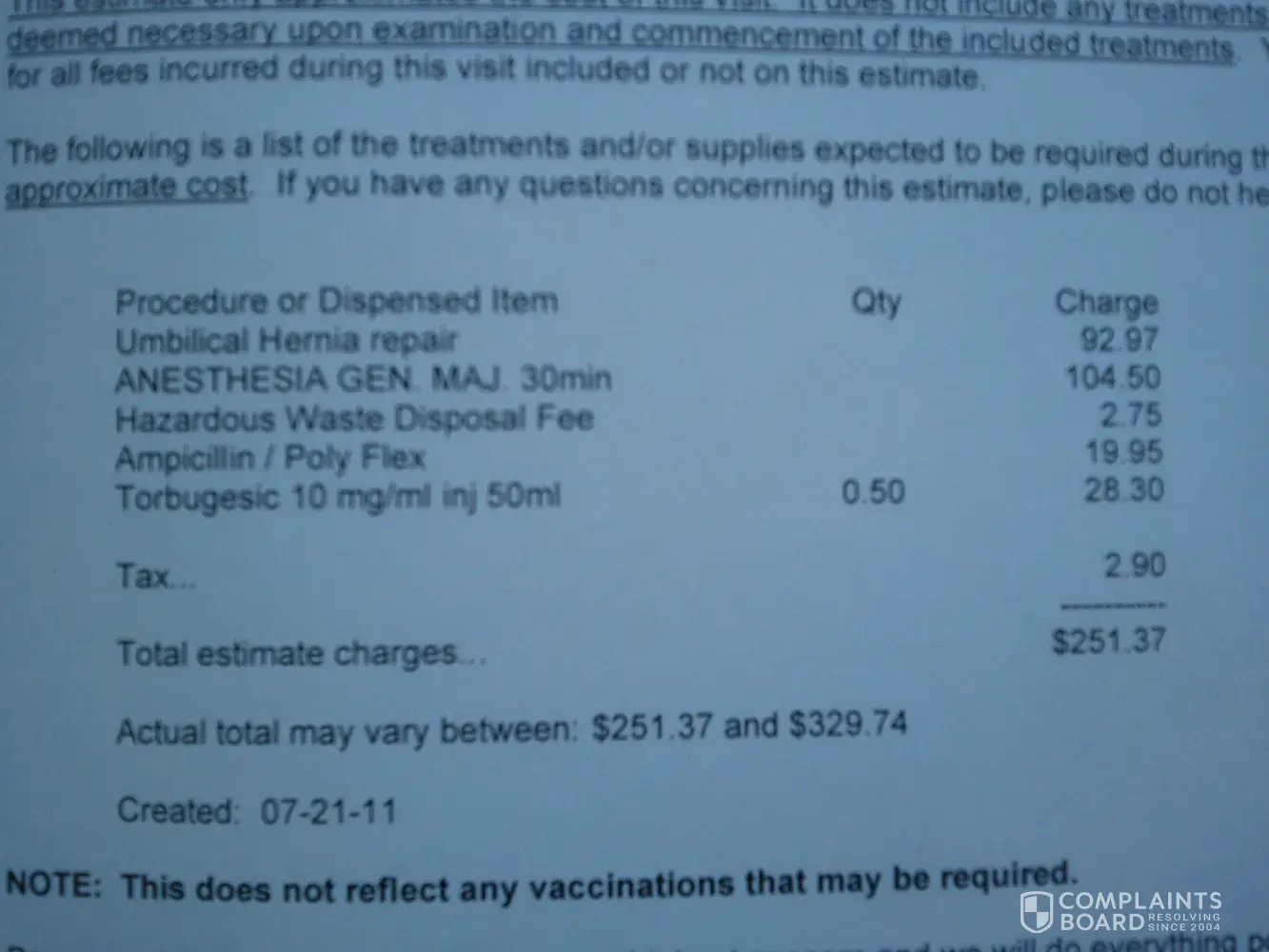 I guess Sherri forgot about the email I sent her containing my pup's vet bill for his check up and meds for worms and an ear infection. and the estimate of the hernia repair. Yes Sherri told me it would go away on its own by 6 months of age. So I waited untill He was almost 7 months old. It was getting worse. The vet did not want me to wait b/c I was risking his intestines coming through the hole and twisting. I attached the estimate here. I was never able to send her the final bill after his surgery b/c She cussed me out and told me to never write or call her again. I never got a contract or breeder support. I just got 1/3 of the cost of the surgery back ($100) after begging her and filing a complaint with Fl dpt of agriculture and consumer services. Yes, Sherri breeds awesome dogs but they come at a very high cost, lots of drama, and even more cost for surgeries. Clyde's surgery was very minor compared to other dogs she has bred. I know of some with hip problems and even one she posted a picture on this board with HOD. Im still having to deal with Sherri's drama and my puppy is now 9 months old. I posted my complaint for you to see. I can't keep going rounds with Sherri. Its all to exhausting.