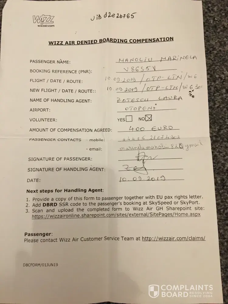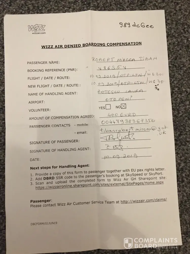 Hi I would like to claim 400 euro compensation for denied boarding on flight W6 3007 as no place on flight and postpone my leave to 15:05 with flight W6 3007 which had one hour delay leave from Otp and arrived at LTN at 18:50 . I would like to know were I can post the pictures or proofs that I need to provide? I would also like to know when and how will it be reimbursed. Kind regards Marinela