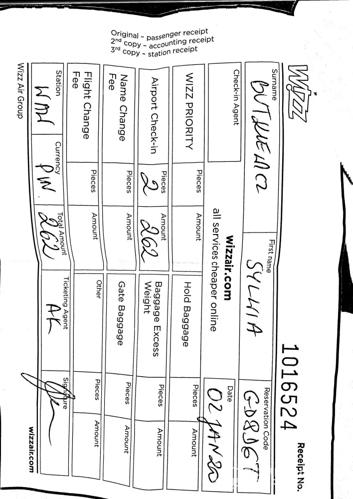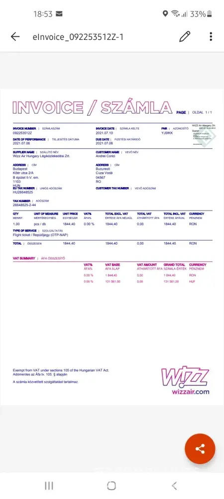 Re Wizz Air electronic invoice BWUK-2822589 / PF17RT