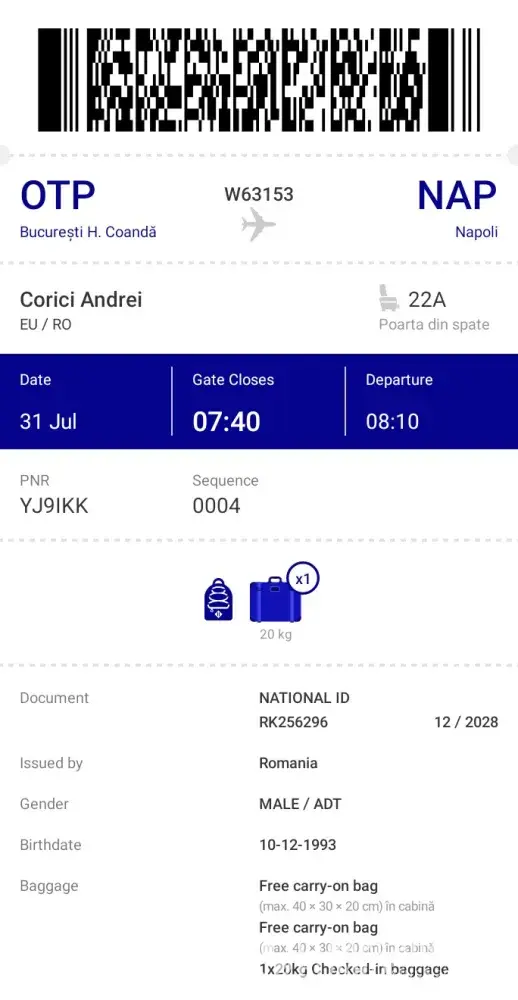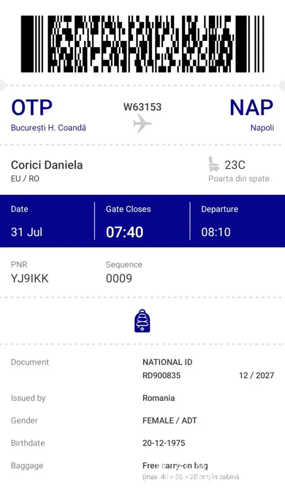 Ne au ținut la predarea bagajelor 4h și jumătate, noi am fost cu 4 h jumătate inainte de zbor in aeroport, am mers la ea I am explicat ca pierdem zborul și ne a asigurat ca nu vom pierde pana nu sunt toți pasagerii în avion, surpriza avionul plecase.mentionez ca au bagat alți pasageri înaintea noastră de la alt zbor.
