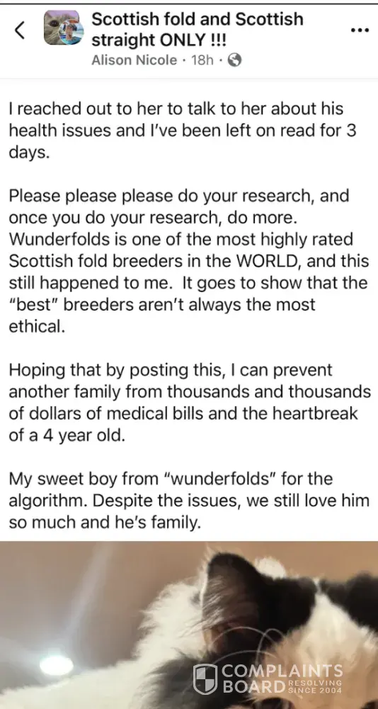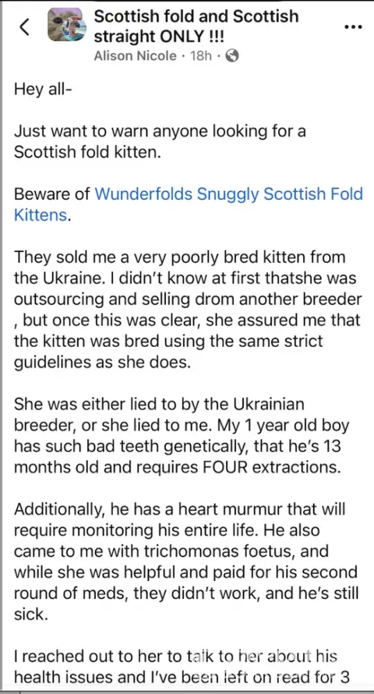 sold us a sick Scottish fold. she shows, and is supposedly a top person, so we bought from her. biggest heartbreak ever. wasn't even her cat SHE IS SELLING SICK CSTS FOR OTHER BREEDERS! Found this online, and realized/verified she did the same TO US! I am in USA, and she HATEs us in the USA! so greedy, deals in heartbreak