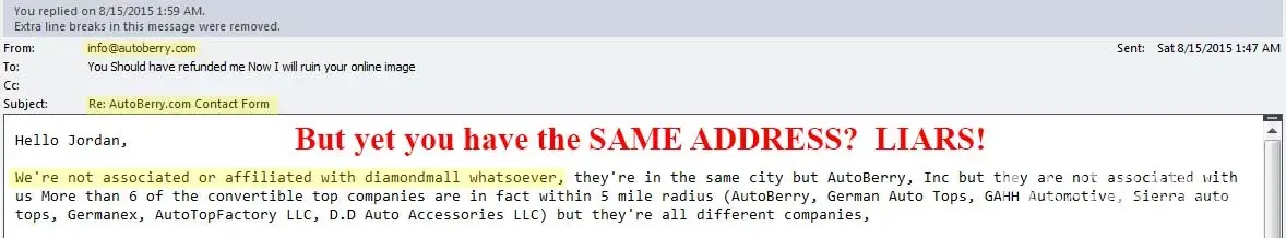 Furthermore, instead of fixing the problem you want to say I'm extorting you. Call your lawyer and see what he says. You sold me a convertible top that busted within one week of it installed, then you denied ownership of your eBay store (diamondmall) that has the EXACT same address as www.autoberry.com - YOU'RE A LIAR AND A CHEAT! People need to know!