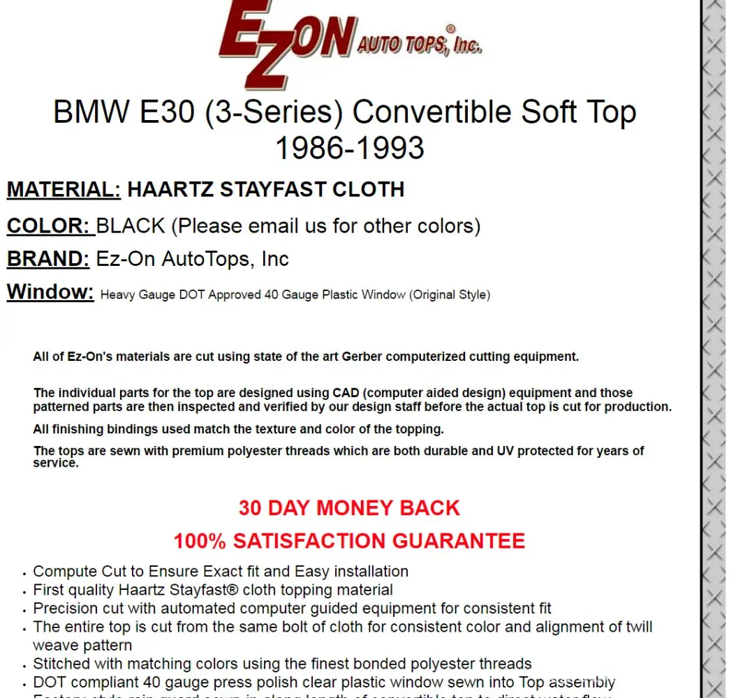 I ordered a convertible top from what I thought was a reputable seller on eBay. They had great reviews but it's all a scam. I had the convertible top installed by a BMW technician and within 2 weeks the window popped out of the vinyl.