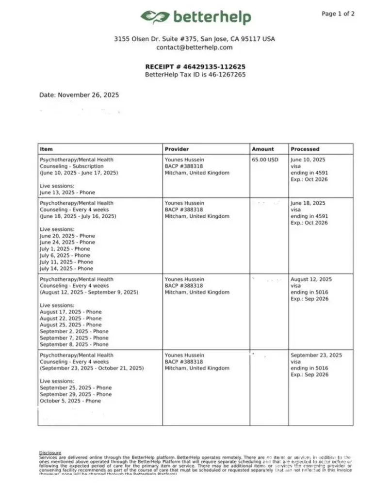 BetterHelp review: Therapist younes hussein BACP38818