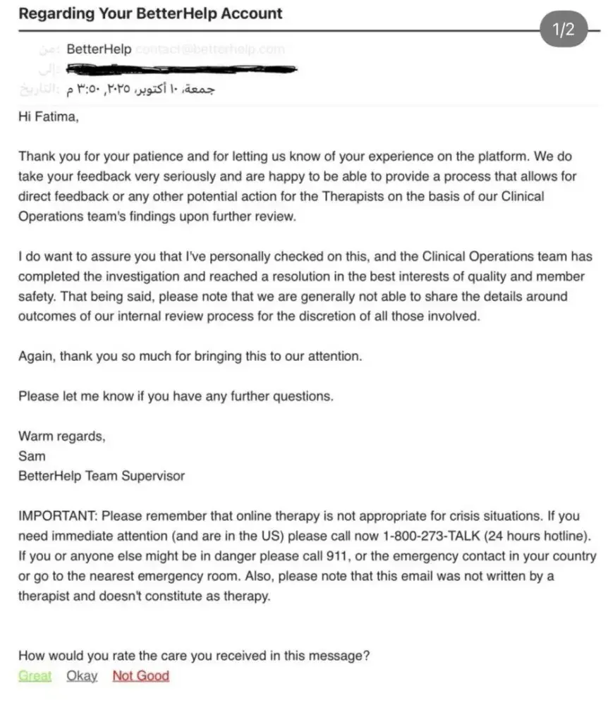 I used the BetterHelp app to work through my childhood traumas. It matched me with a religious therapist named Younes Hussein, who committed multiple violations, such as forcing me to make decisions I did not want, repeated delays and missed sessions, giving religious judgments, and ending the therapeutic relationship after a disagreement. When I filed a complaint, they said they had taken action against him, but could not inform me of the details.
