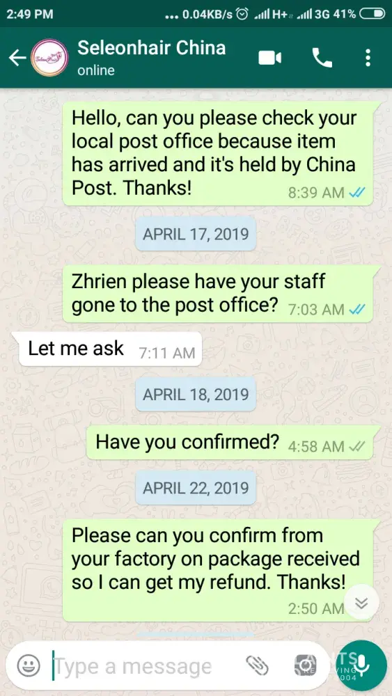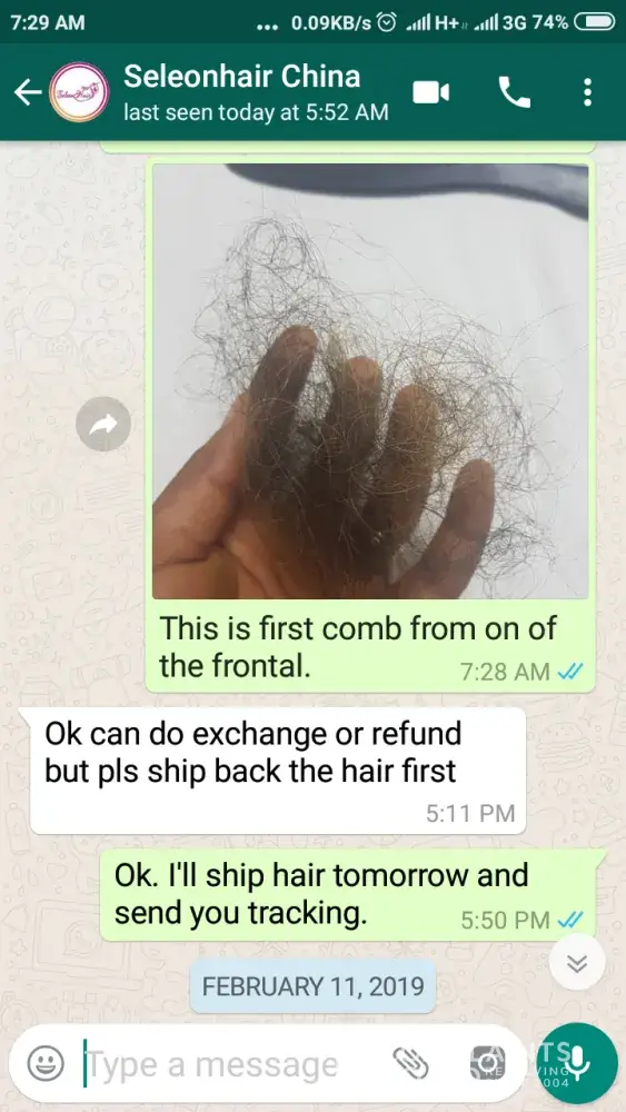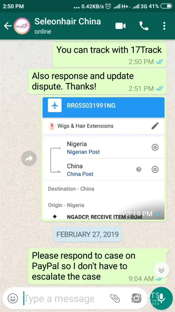 I purchased two hair frontals from @seleonhair and it's of bad quality, the hair frontals has smell and ombre was not to my specification even after I sent a video before purchasing frontal. I sent a message to complain about the hair I received, but seller read my messages and didn't reply. After a day or two I contacted the seller again @seleonhair told me they can't do anything because of the Chinese hoilday and told me to contact the them on the 10th of February which I did, but still no response. All our chats were done via WhatsApp & the seller has read my messages of complains but has refused to reply. The seller has been online several times today and still no response from them. It's clear the seller don't want to resolve these issue. So I went ahead to open dispute on PayPal before seller reply my unread messages on WhatsApp. @seleonhair ask me to return hair frontals for a refund or exchange and I agreed to a refund. I sent back the frontals(hair) on the 11th of February 2019 via Nipost, during transit I chatted with @seleonhair severally to confirm if they have gotten the hair frontals and their response was NO. Three weeks ago I contacted @seleonhair to go to the Post office to pick up hair frontals so I can get my refund, They said ok. Two days later I contacted again to confirm if they have picked up hair frontals and no response from them. I sent them messages for more than two week, still no response. Five days later, I sent them an email and still no response. Total amount to be refunded is $117.15
