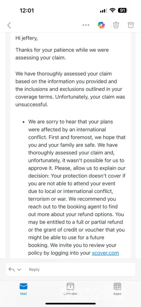 I had a trip to Abu Dhabi for a cruise on MSC that was cancelled because of Iran conflict with a port on a planned route. Xcover wouldn't refund my flights and said my claim wasn’t valid due to conflict in the area. I bought this insurance from Turkish Air when I booked my flight.