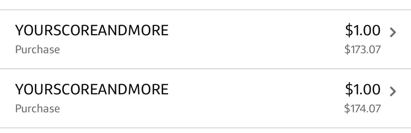 On September 16, 2025, I noticed two unauthorized charges of $1.00 each from “Your Score and More.†I never knowingly signed up for this service, nor was I provided any disclosure or contact information with the charge. After searching online, I located a number (1-800-950-8040) and called. On September 22, 2025, I discovered an additional charge of...