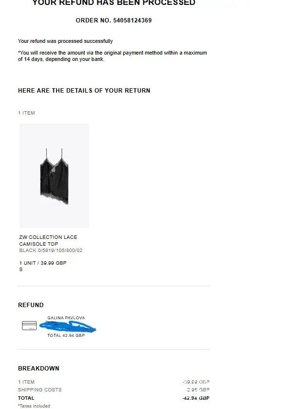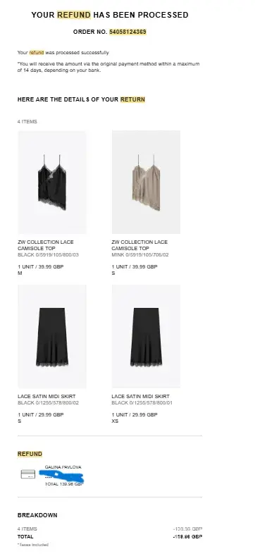 I ordered two specific handbags from Zara Spain (order #53859800625, placed on July 27, 2025). Instead of receiving my handbags, I got FIVE completely unrelated clothing items. This was clearly a packing error in their warehouse – not a shipping mistake and definitely not my fault. I contacted their customer service multiple times, explaining the...