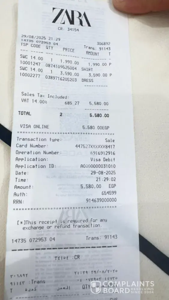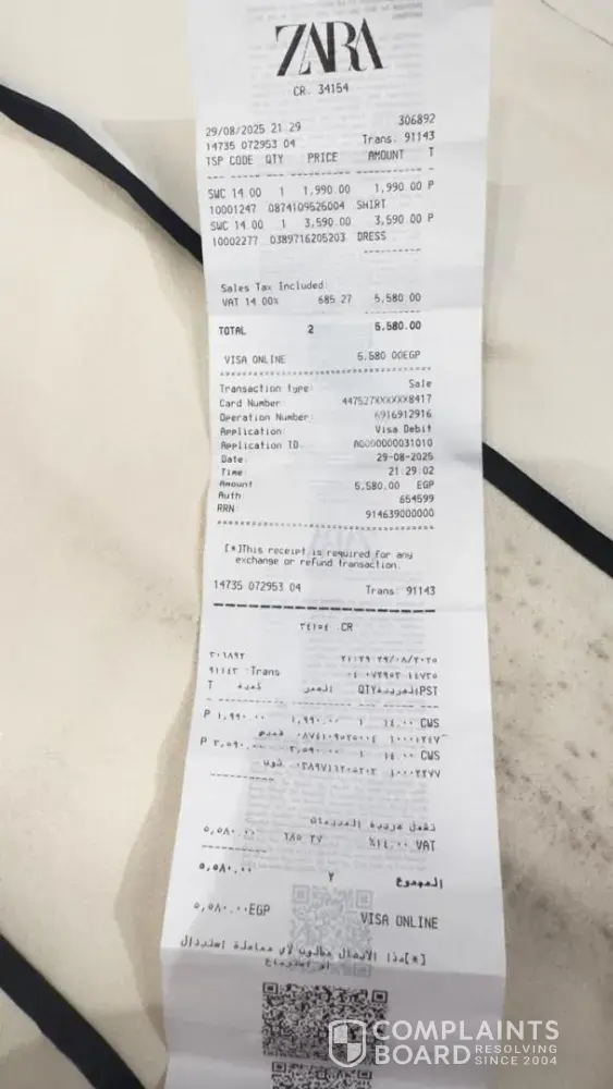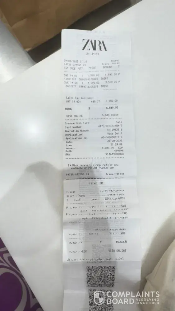 When I returned to the store to exchange or return the item, I was met with unprofessional and disrespectful treatment. Instead of resolving the issue, the staff shifted the blame onto me, claiming it was my responsibility to check the dress before purchase. The employees – including Mohamed Sufi, Ahmed, and Ahmed Hussein – whispered among themselves as if deliberately concealing information from me. I was falsely accused of having used the dress, which is both insulting and entirely untrue.