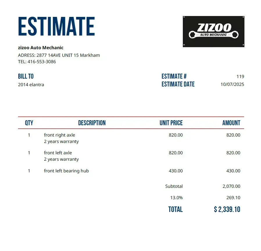 I paid over $3,100 cash at Zizoo Auto Mechanic for axle and hub replacements on my Hyundai Elantra. A Hyundai dealership inspection later confirmed the axles were never replaced. Despite this, I was charged $820 per axle and $430 for the hub, nearly double Hyundai’s pricing. Tie rods were changed without authorization, and I received no proper invoice —...